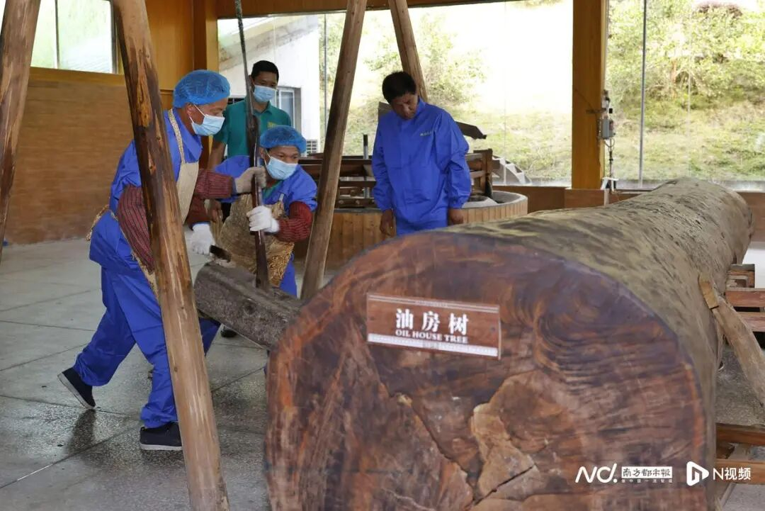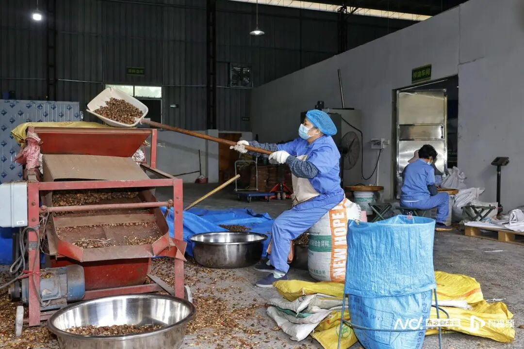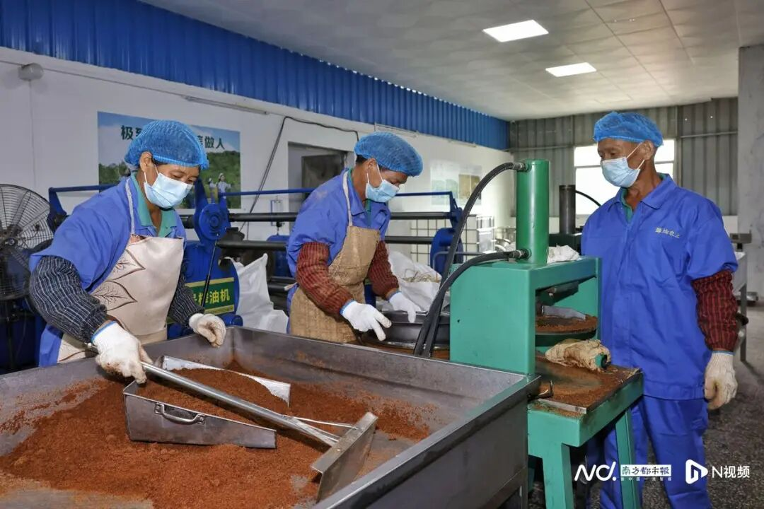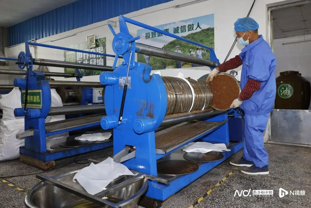 10月25日,在河源市龙川县赤光镇的一家油茶企业,工人们在进行一道道油茶榨油工序。