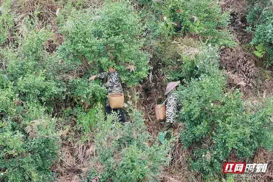 在中方镇炉亭坳油茶种植示范基地,县林业局产业发展中心主任黄明银正带领技术人员与村民开展测产作业。现场,工作人员通过无人机精准找准东方位角,用卷尺丈量划定一亩油茶树范围,再以红色脱线环绕标记,确保测产区域精准无误。随后,村民们挎着竹篓穿梭林间,熟练地将枝头油茶果尽数采摘、装袋、过磅。经现场称重,该片基地一亩地产油茶鲜果达928公斤,较往年增产 8% 左右,丰收的喜悦写满每位村民的脸庞。