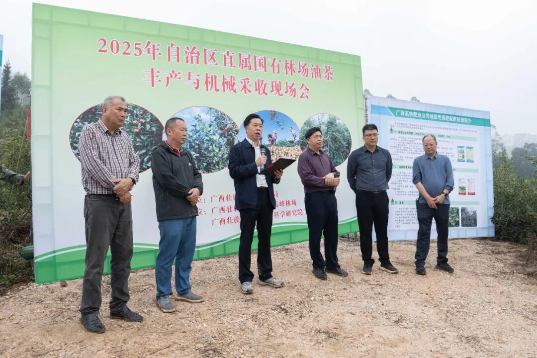 2025年11月7日,自治区直属国有林场油茶丰产与机械采收现场会在高峰林场召开。自治区林业局二级巡视员蒋桂雄出席会议并讲话。