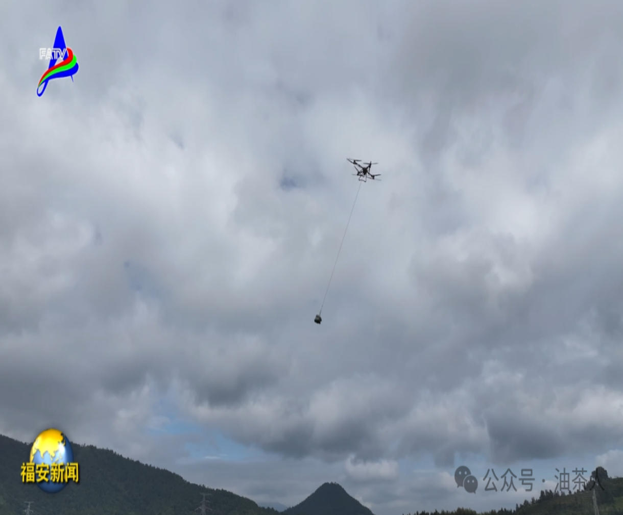 为保障油茶果应收尽收,该基地开启“人机协同”作业模式,便携振动式采摘机、轨道运输车、吊装无人机等新机具设备齐上阵,从油茶果的采摘到运输各环节高效助力。