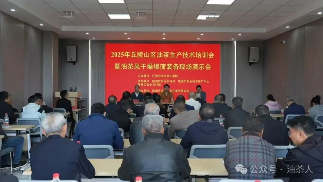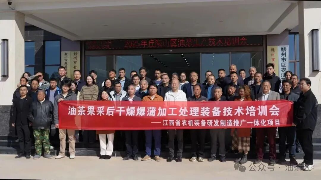 2025年11月26日,在赣县赣州市金溪农业开发有限公司举办2025年丘陵山区油茶生产技术培训会暨油茶果干燥爆蒲装备现场演示会。