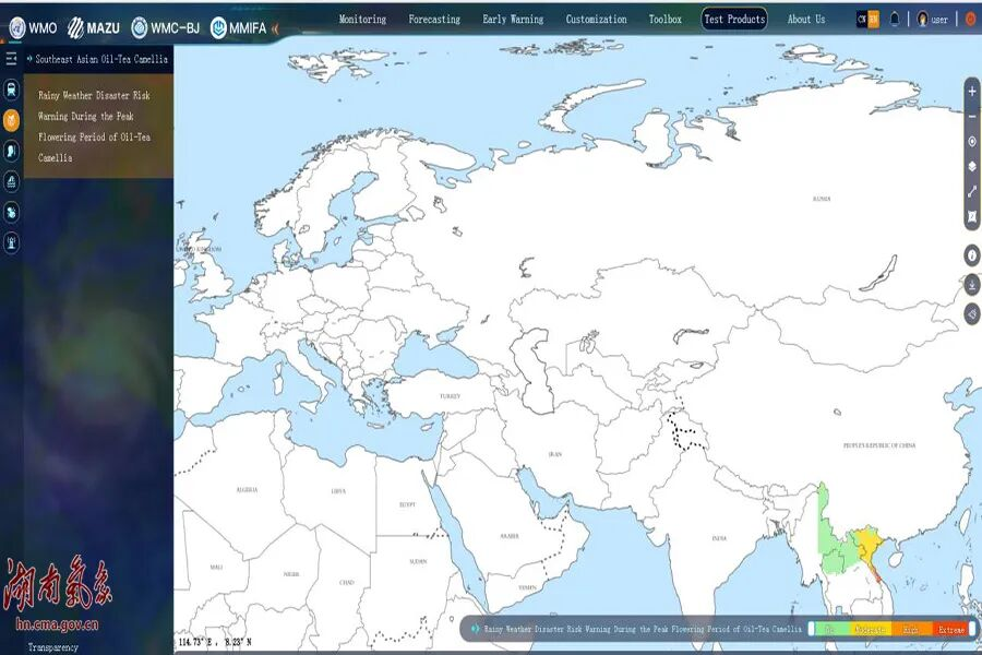 近日,由湖南省气象局自主研发的东南亚油茶主要气象灾害风险预警产品,接入中国气象局“妈祖(MAZU)”全民早期预警平台(访问网址:http://106.120.80.203/EW4ALL/evaluationProduct)试运行,该产品是湖南省气象部门着力开展全球早期预警服务的探索实践。