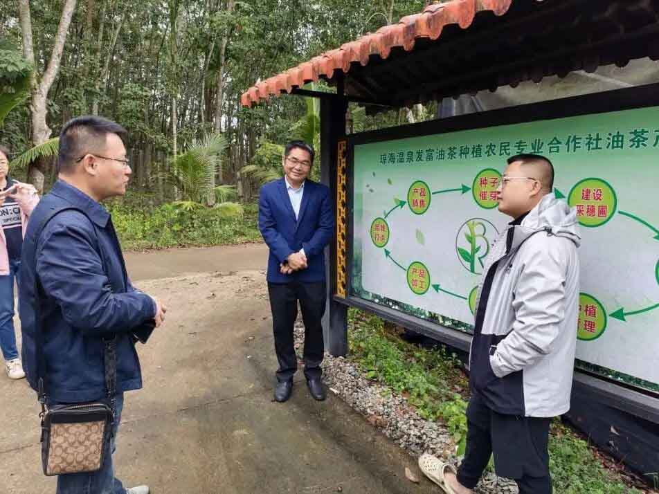 随后,在琼海市热带作物服务中心主任戴俊陪同下,考察组相继调研了国家油茶科学中心热带试验站油茶良种资源圃(琼海)、海南品香园食品有限公司、海南圣露热带农作物开发有限公司及温泉发富、琼海恒萃两家油茶种植加工农民专业合作社,重点就种苗繁育与销售、籽仁热加工关键工艺及“海南山柚油”品牌打造与合作社负责人、企业主进行了深入交流。