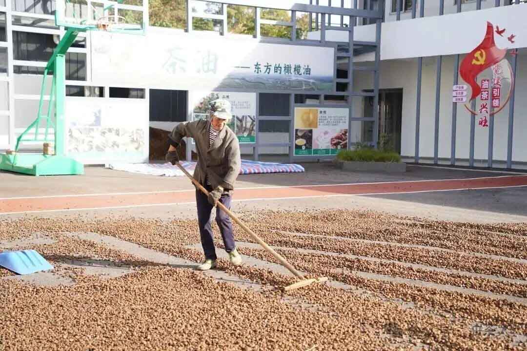 这片花海不仅是景色,树上结出的油茶果更成为村民们致富的底气。在村里的油坊里,前期采收后的油茶果经过剥壳、晾晒、烘干、粉碎等处理后,此刻正被送入榨油机进行压榨。经过一系列工序后,原本不起眼的油茶籽变成了清澈透亮的山茶油,浓郁的香气瞬间弥漫整个工坊。