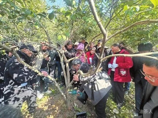午后的盘龙山油茶示范基地,阳光透过枝叶洒下斑驳光影。“发黑的是病虫枝,枯枝要从基部剪除,留枝要兼顾通风透光……”湖南大果油茶研究院专家卢世魁蹲在低产油茶树下,手把手指导学员辨识枝条、掌握剪枝力度。学员们围成一圈,有的仔细观察,有的上手实操,遇到疑问当场请教,基地里不时响起讨论声、欢笑声。“以前自己瞎剪,越剪产量越低,现在专家手把手教,剪口怎么斜、留枝留多高,都讲得明明白白,这下心里有底了!”友好村村民李云仨拿着新学的技术,当场完成了3棵树的规范修剪,脸上满是收获的笑容。
