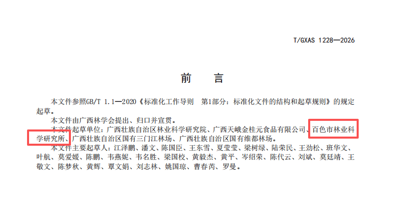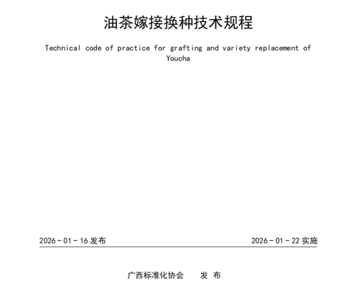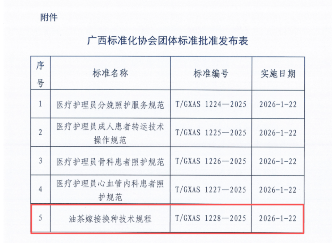 近日,广西标准化协会发布 2026 年第 3 号(总第 451 号)团体标准公告,批准《医疗护理员分娩照护服务规范》等 5 项团体标准正式实施。其中,由百色市林业科学研究所作为主要参编单位(排名第三)深度参与编制的《油茶嫁接换种技术规程》(T/GXAS 1228—2026)成功入选,将于 2026 年 1 月 22 日正式实施。该标准的发布,标志着广西油茶嫁接换种技术全面迈入标准化、规范化发展新阶段,为全区油茶产业提质增效、高质量发展筑牢技术根基。