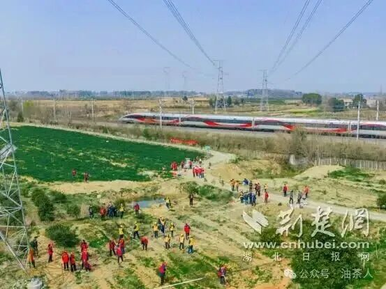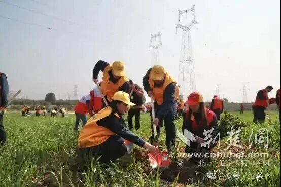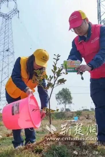 3月11日早晨,温柔的阳光穿透薄雾,洒在合武高铁沿线。四勿岗村的一处田野上,国网武汉市黄陂区供电公司蔡榨供电所所长潘钟毓带领志愿者们分工协作,挖坑、扶苗、培土、浇水,动作娴熟而有序。