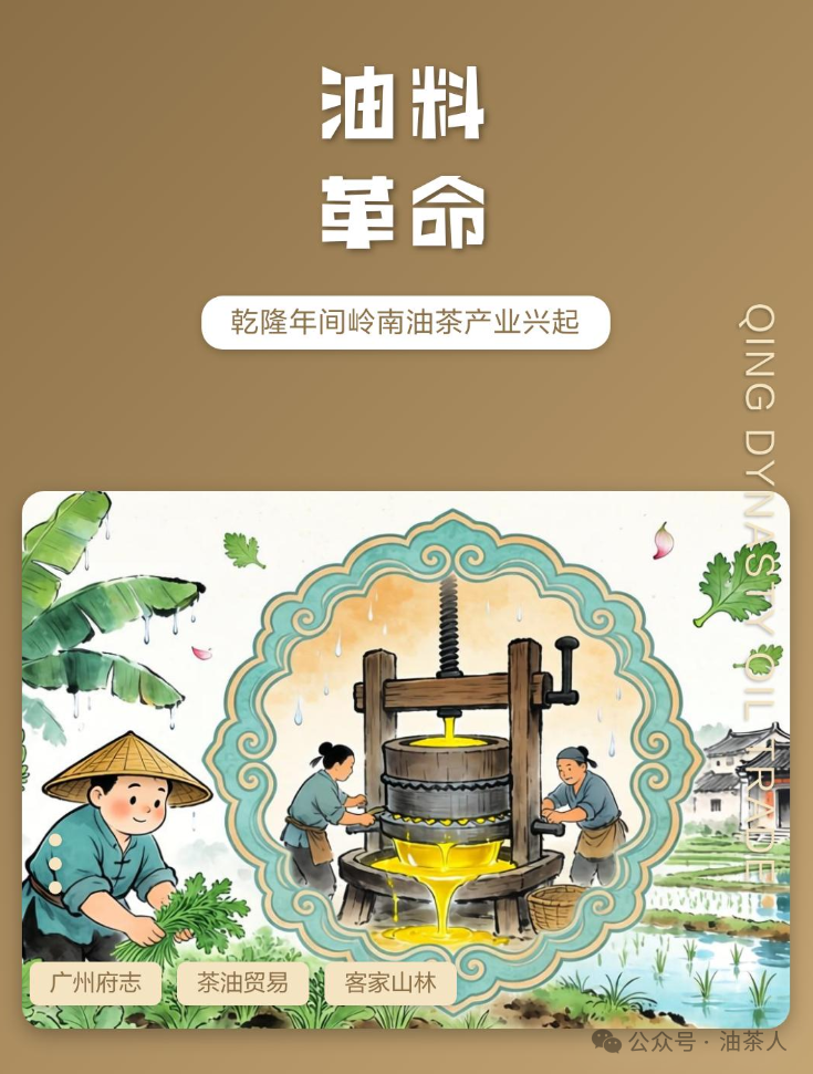 两百公里外的龙川县,客家人骆阿婆至今记得祖传的榨油口诀:“霜降摘果,立冬开榨”。她家后山的油茶林,早在秦朝就有种植,但直到乾隆年间才真正变成“摇钱树”。当时广州口岸的商人发现,茶油不仅耐储存,还能润滑精密的西洋钟表齿轮,价比丝绸。朝廷征收的“油课”从芝麻、菜籽转向茶油,山民们突然发现,祖辈嫌弃“五年才结果”的油茶树,竟比稻田更值钱。